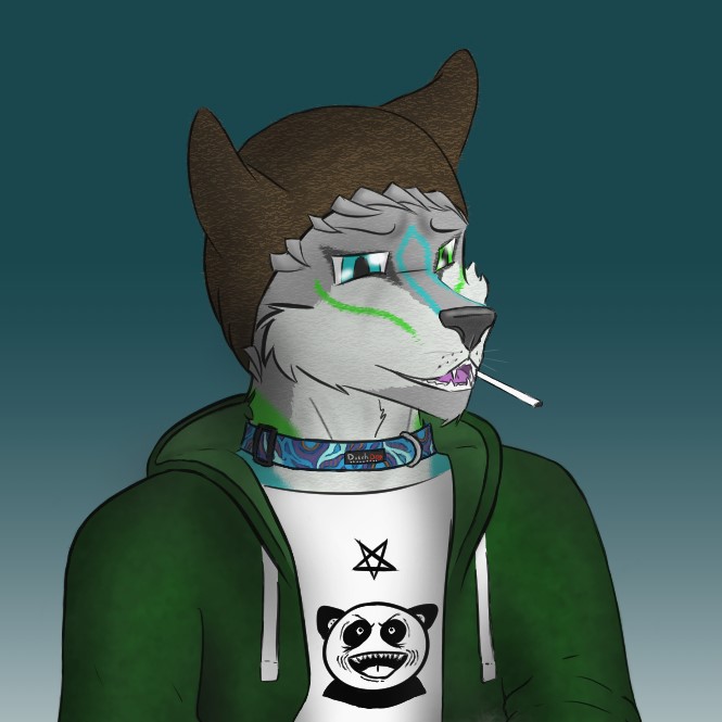 Full Name: Kei Species: Husky/Wolf Gender: Male Age: 21 Height: 6'1" Build: Slender Sexuality: Homosexual Nature: Introverted, Sincere, Caring, Self-Loathing Fur: Steel Grey with white belly and sock markings Secondary Markings: Leaf Green & Turquoise Blue streaks on his head, back, tail & ankles Eyes: (left) Leaf Green, (right) Blue